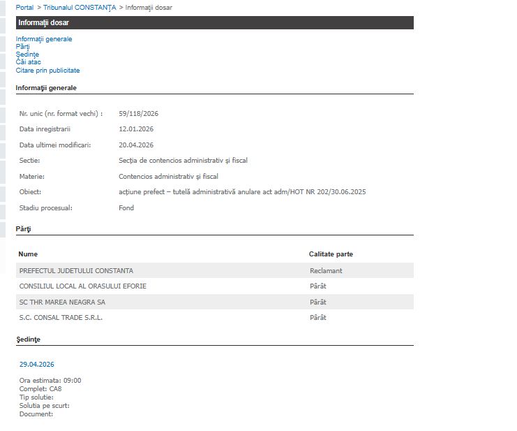 Dosarul, înregistrat la începutul acestui an, reprezintă o acțiune de tutelă administrativă ce vizează Hotărârea Consiliului Local (hotărârea) nr. 202 din 30 iunie 2025. Pe lângă autoritatea locală din Eforie, în proces sunt citate ca pârâte și societățile comerciale THR Marea Neagră SA și Consal Trade SRL.