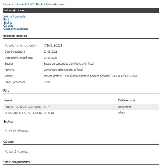 Dosarul, înregistrat la Tribunalul Constanța pe 23 septembrie 2025, are ca obiect "acțiune prefect- tutelă administrativă anulare act administrativ/HCL NR 12/13.03.2025" și se află în stadiul de fond.