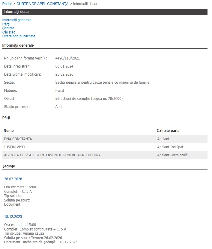 Decizia Tribunalului Constanța a fost contestată atât de Iusein Visel, cât și de procurorii DNA și de Agenția de Plăți și Intervenție pentru Agricultură, fapt pentru care dosarul cu indicativul 4490/118/2021 a fost înaintat spre soluționare Curții de Apel Constanța, instanță la care, potrivit Portalului Instanțelor de Judecată, edilul a fost chemat la înfățișare astăzi, 20.02.2026.