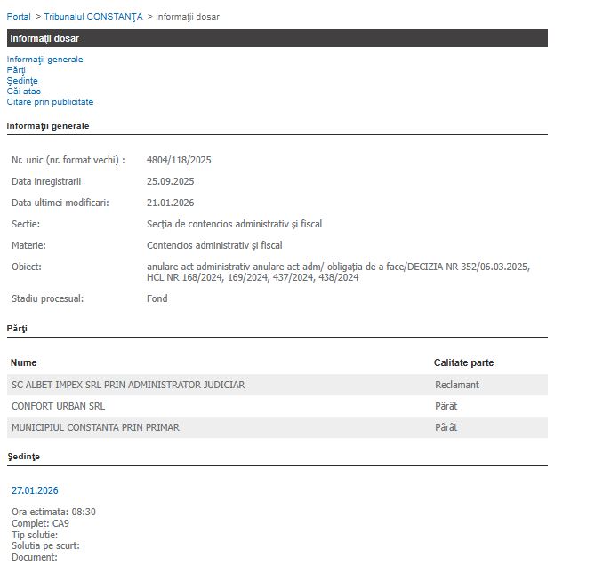 Azi, 27 ianuarie, la Tribunalul Constanța a fost fixat termen în procesul dintre Albet Impex SRL și Primăria Constanța. În dosar sunnt vizate reguli de prelungire a contractelor de locuințe.Potrivit Portalului Instanțelor de Judecată, ședința are loc la ora 08.30, complet CA9.