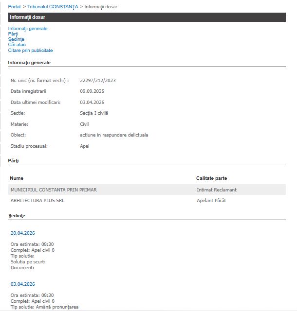 Tribunalul Constanța a programat pentru data de 20 aprilie 2026 un nou termen în dosarul de apel care vizează litigiul dintre Municipiul Constanța și societatea Arhitectura Plus SRL. Obiectul principal al cauzei este „acțiune în răspundere delictuală”