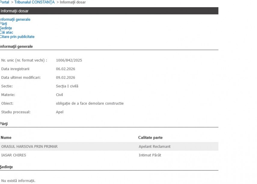 Primarul orașului Hârșova, județul Constanța, a declarat apel la data de 30 ianuarie 2026 în dosarul nr. 1006/842/2025, deschis la data de 20 iunie 2025, împotriva lui Iașar Chires.