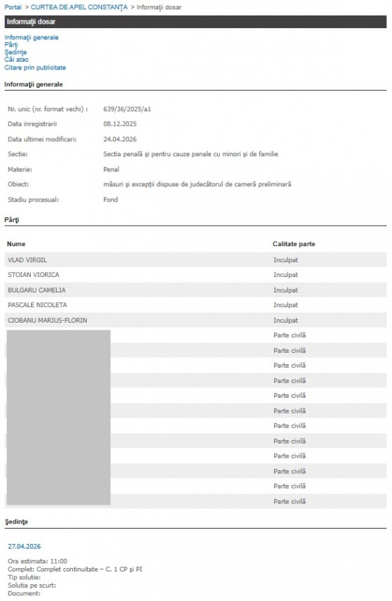 Procesul în dosarul denumit generic „Fabrica de Moșteniri”, în care 26 de inculpați au fost trimiși în judecată, este în plină derulare la Curtea de Apel Constanța! În cursul acestei zile, 27.04.2026, se desfășoară o nouă ședință de judecată.
