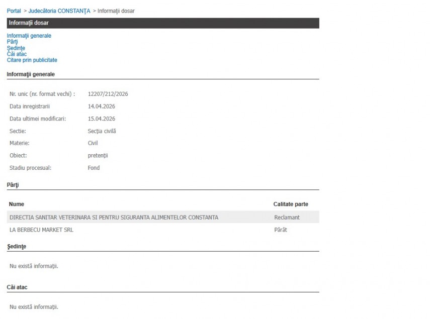 În acest proces, reclamant este Direcția Sanitar Veterinară și pentru Siguranța Alimentelor Constanța, în timp ce pârât este La Barbecu Market SRL.