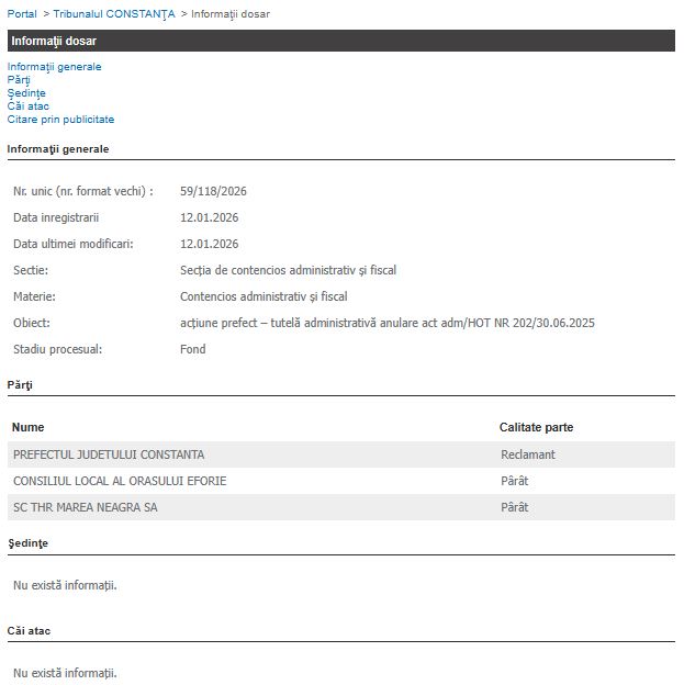Un nou dosar a fost înregistrat pe rolul Tribunalului Constanța, având ca obiect anularea unei hotărâri de consiliu local. Potrivit informațiilor publicate pe portalul instanțelor de judecată, dosarul cu numărul 59/118/2026 a fost înregistrat la data de 12 ianuarie 2026 și se află în prezent în stadiul procesual de fond.Cauza este soluționată de Secția de contencios administrativ și fiscal și vizează o acțiune formulată de prefect, în cadrul atribuțiilor de tutelă administrativă, prin care se solicită anularea Hotărârii Consiliului Local Eforie nr. 202 din 30 iunie 2025.
