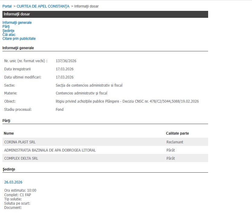 Un litigiu legat de o procedură de achiziții publice a fost înregistrat pe rolul Curții de Apel Constanța.