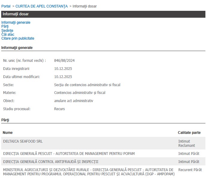 Pe rolul Curții de Apel Constanța se află dosarul cu nr. 846/88/2024 , părțile implicate fiind Deltaica Seafood SRL, în calitate de intimat reclamant și Direcţia Generală Pescuit - Autoritatea de Management pentru Popam, ca intimat pârât și Direcţia Generală Control Antifraudă și Inspecţii, ca recurent pârât.