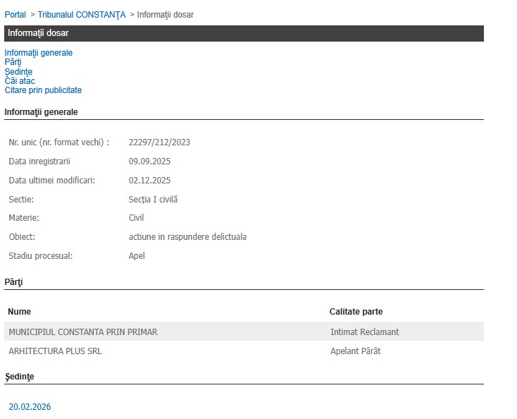 Procesul dintre Primăria Constanța versus Arhitectura Plus SRL a ajuns la Tribunalul Constanța. Următorul termen, în februarie 2026