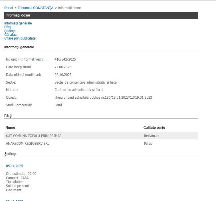 UAT Comuna Topalu prin Primar, în calitate de reclamant, s-a judecat astăzi, 22.10.2025, la Tribunalul Constanța cu firma Anarecom Regioserv SRL, în calitate de pârât.