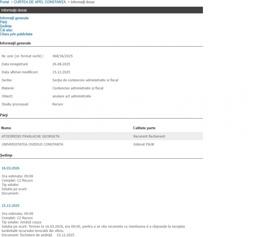 Curtea de Apel Constanța a avut astăzi, 15 decembrie a.c., de judecat recursul formulat de Atodiresei Pavalache Georgeta în procesul intentat contra Universității „Ovidius” Constanța.