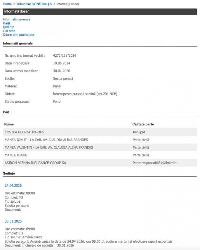 La data de 30 ianuarie 2026, instanța a stabilit ca următorul termen să aibă loc la finele lunii aprilie. Astfel, Tribunalul Constanța a anunțat că vor fi audiați martori și că în cauză va fi efectuat raport de expertiză.