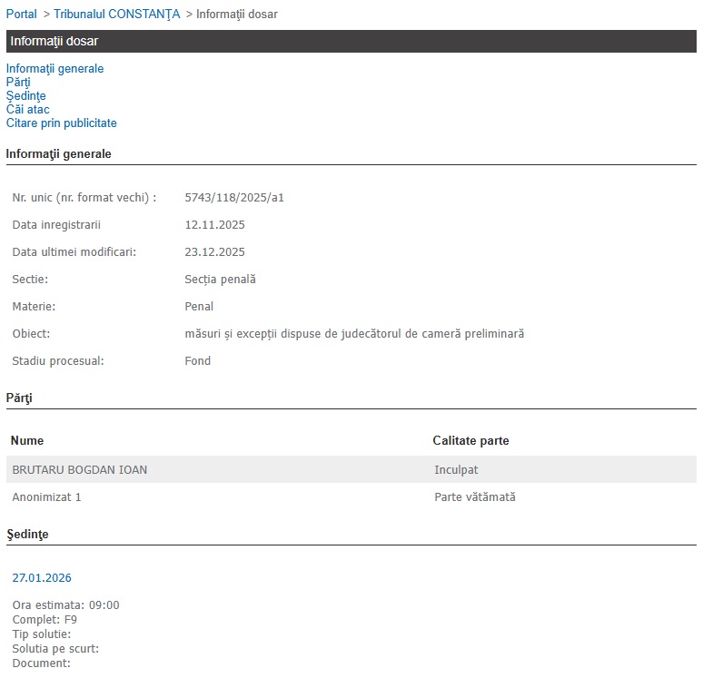 Amintim că actualmente Brutaru Bogdan Ioan se află în arest preventiv, urmând ca la următorul termen din 08.01.2026 Tribunalul Constanța să stabilească dacă va menține aceleași măsuri preventive, ori dacă va dispune măsuri mai blânde.
