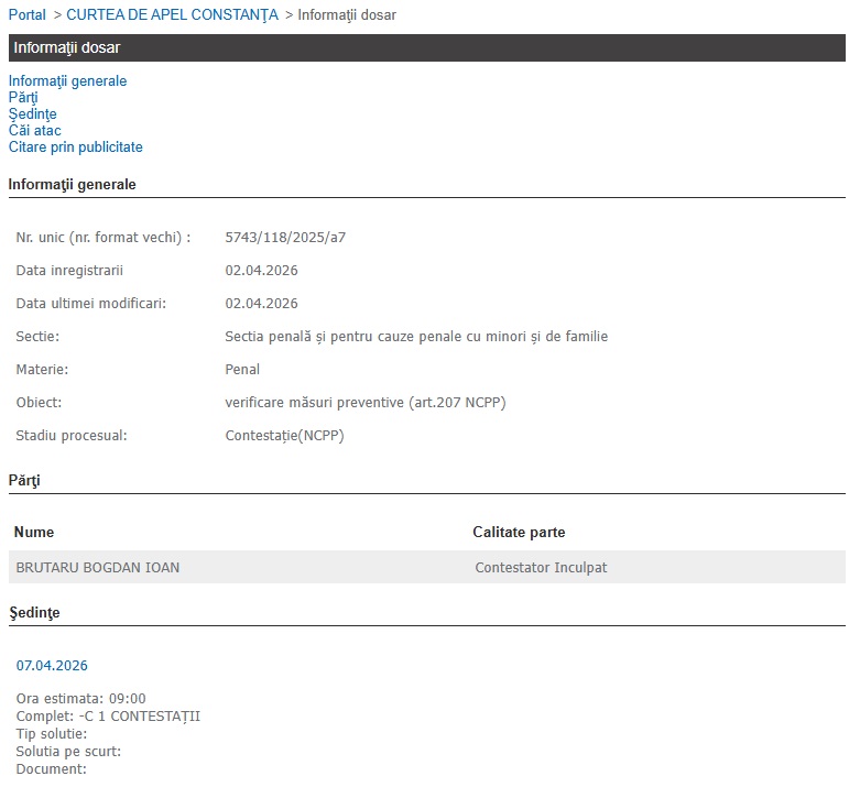 Potrivit Portalului Instanțelor de Judecată, măsura preventivă ar fi urmat să fie verificată până la data de 28.04.2026, însă inculpatul a depus contestație și așteaptă decizia Curții de Apel.