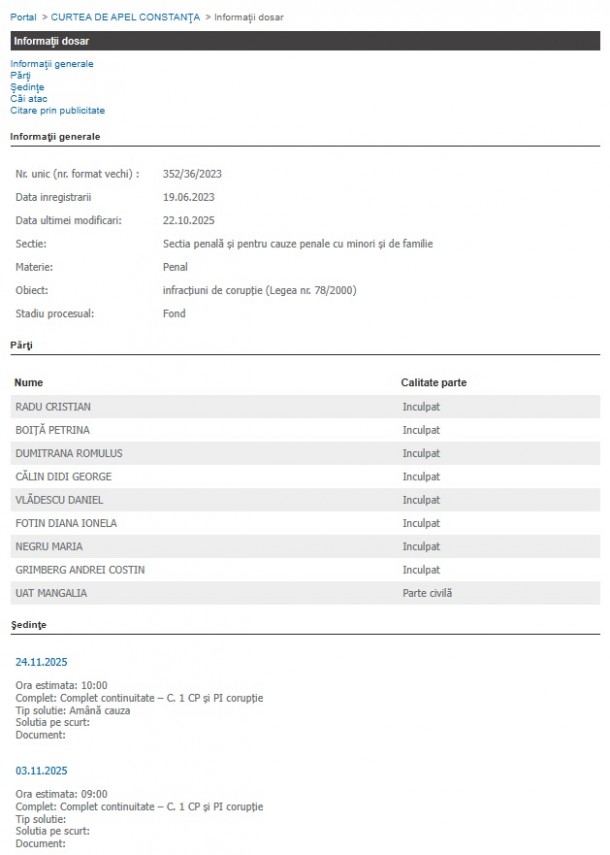 Potrivit Portalului Instanțelor de Judecată, Curtea de Apel Constanța este așteptată astăzi să se pronunțe cu privire la probele solictate de părți. Judecata va continua, fiind stabilit un termen ulterior pentru data de 24.11.2025.