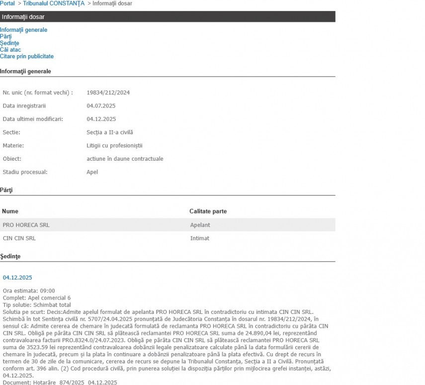 „Solutia pe scurt: Decis:Admite apelul formulat de apelanta PRO HORECA SRL în contradictoriu cu intimata CIN CIN SRL. Schimbă în tot Sentinţa civilă nr. 5707/24.04.2025 pronunţată de Judecătoria Constanţa în dosarul nr. 19834/212/2024, în sensul că: Admite cererea de chemare în judecată formulată de reclamanta PRO HORECA SRL în contradictoriu cu pârâta CIN CIN SRL. Obligă pe pârâta CIN CIN SRL să plătească reclamantei PRO HORECA SRL suma de 24.890,04 lei, reprezentând contravaloarea facturii PRO.8324.0/24.07.2023. Obligă pe pârâta CIN CIN SRL să plătească reclamantei PRO HORECA SRL suma de 3523.59 lei reprezentând contravaloarea dobânzii legale penalizatoare calculate până la data formulării cererii de chemare în judecată, precum şi la plata în continuare a dobânzii penalizatoare până la plata efectivă. Cu drept de recurs în termen de 30 de zile de la comunicare, cererea de recurs se depune la Tribunalul Constanţa, Secţia a II a Civilă. Pronunţată conform art. 396 alin. (2) Cod procedură civilă, prin punerea soluţiei la dispoziţia părţilor prin mijlocirea grefei instanţei, astăzi, 04.12.2025.