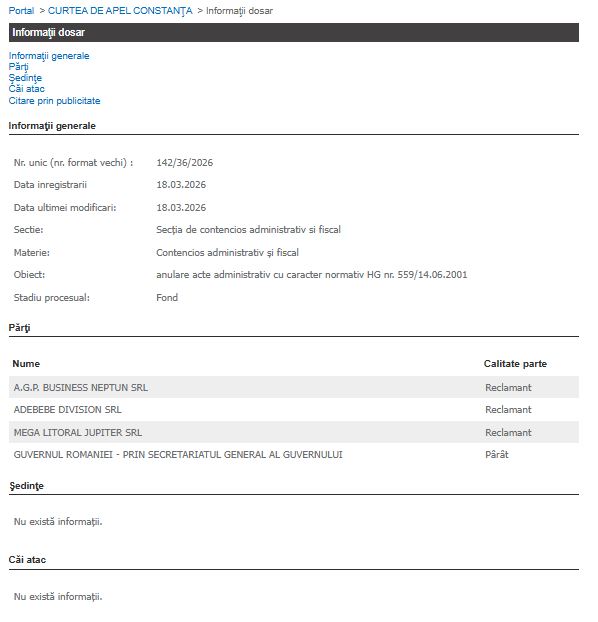 Curtea de Apel Constanța a înregistrat recent o acțiune în instanță prin care mai multe societăți comerciale cu activitate în sudul litoralului solicită anularea unui act administrativ cu caracter normativ emis de Executiv. Dosarul, înregistrat sub numărul 142/36/2026, vizează direct Hotărârea de Guvern nr. 559 din 14 iunie 2001.