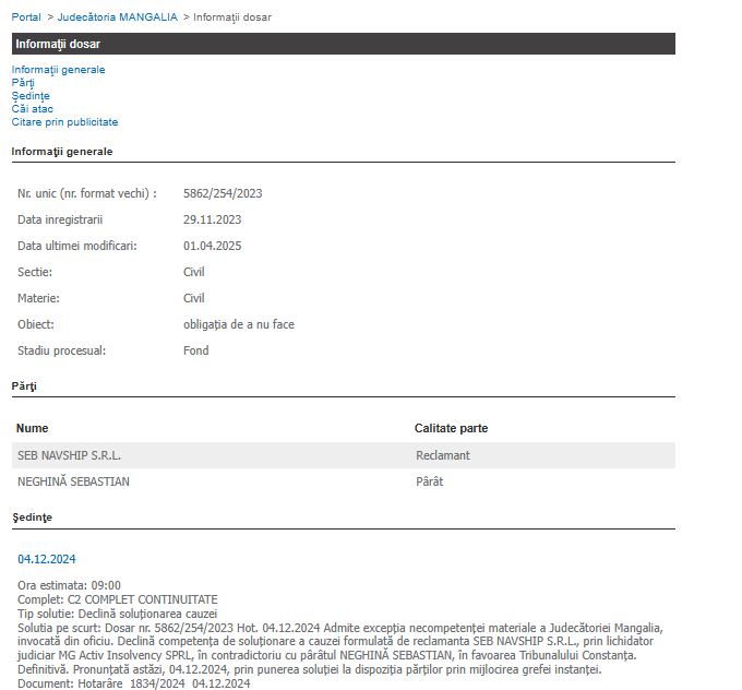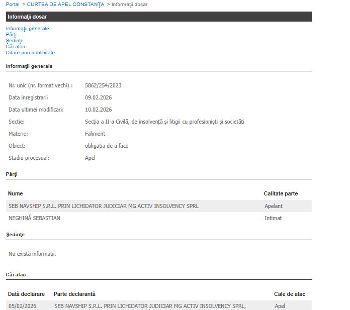 Un proces care a durat mai bine de doi ani și a trecut prin trei instanțe diferite, se pregătește de faza finală. Disputa juridică dintre firma în faliment Seb Navship SRL, reprezentată de lichidatorul judiciar MG Activ Insolvency SPRL, și pârâtul Sebastian Neghină a fost înregistrată oficial pe rolul Curții de Apel Constanța în data de 9 februarie 2026 (dosar 5862/254/2023).