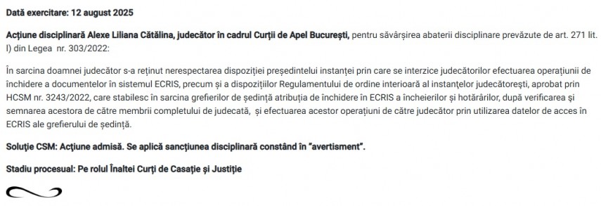 La data de 18 noiembrie 2025, Secția pentru judecători a CSM a dispus aplicarea sancțiunii „avertisment” față de doamna judecător Liliana Cătălina Alexe.