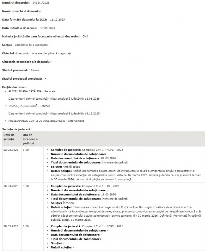 Decembrie 2025: Liliana Cătălina Alexe înregistrează recursul la ÎCCJ (Dosar 2433/1/2025), unde are calitatea de Reclamantă (recurent). Ea cere anularea deciziei CSM.