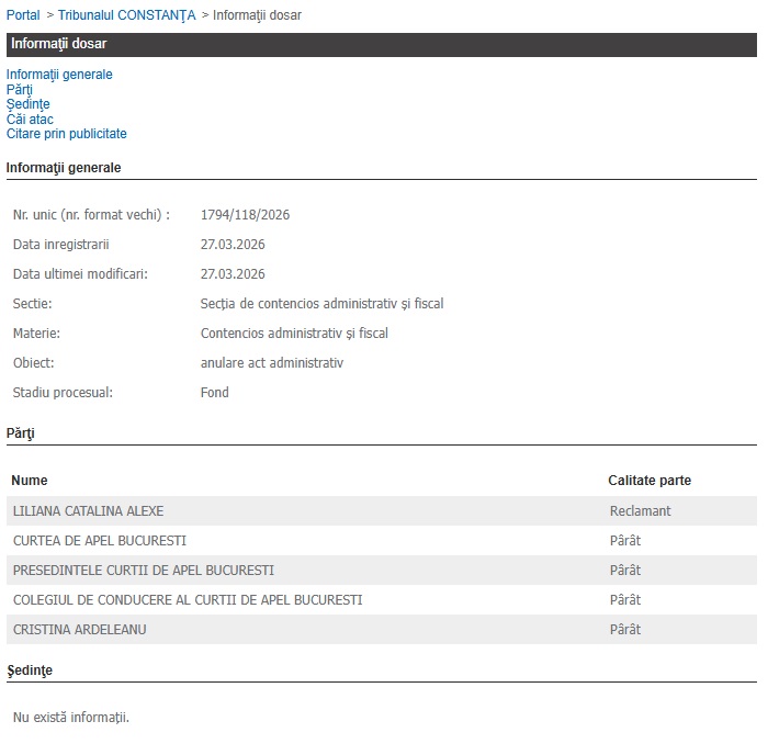 Conflictul, care a început la București, s-a mutat recent la Constanța prin înregistrarea unui dosar de anulare a actului administrativ. Reclamanta, judecătoarea Liliana Cătălina Alexe (Duțu), a deschis acest nou front juridic vizând direct actele administrative și rapoartele de serviciu emise în perioada în care activa la Curtea de Apel București (CAB) sub conducerea administrativă a judecătoarei Cristina Ardeleanu. În această cauză, sunt contestate regulile de „disciplină digitală” privind accesul în sistemul ECRIS, stabilite la nivelul Secției a VIII-a de către conducerea instanței.