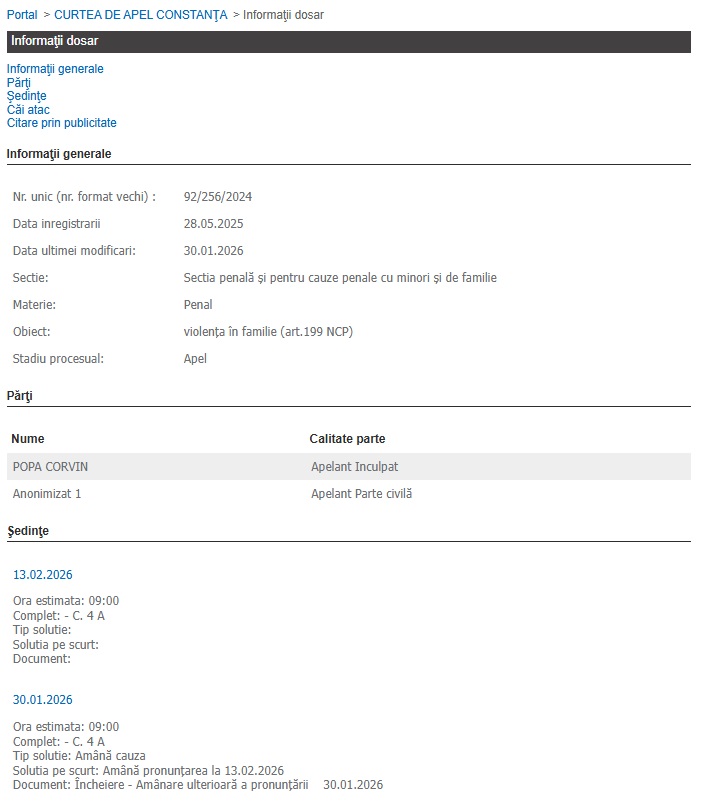 După ce inculpatul a fost deferit justiției în dosarul cu indicativul 92/256/2024, care are ca obiect Violența în familie, Judecătoria Medgidia a dictat pe numele inculpatului o pedeapsă de 1 an de închisoare cu suspendare sub termen de supraveghere de 2 ani, obligându-l totodată la efectuarea a 60 de zile de muncă neremunerată în folosul comunității!