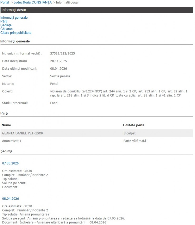 Astfel, la finele lunii noiembrie 2025, pe secția Penală a Judecătoriei Constanța, a fost înregistrat dosarul cu indicativul 37519/212/2025.