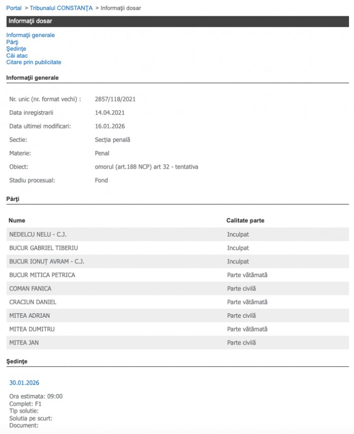 Potrivit Portalului Instanțelor de Judecată, cei trei se află în atenția completului de judecată F1, care potrivit surselor noastre este prezidat de judecătorul Bogdan Mihai Dumitru.