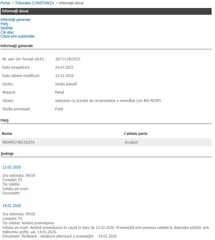 Amintim că în aceeași cauză, un acord de recunoaștere a vinovăției a fost semnat și de către inculpata Laura Iuliana Cocor, acord care a fost trimis spre soluționare Tribunalului Constanța, la data de 24.07.2025.