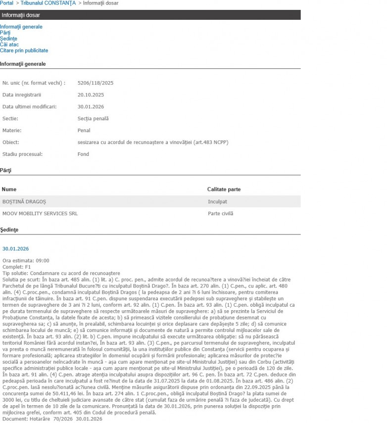 Pe 20 octombrie 2025, Tribunalul Constanța înregistra dosarul 5206/118/2025 în care inculpatul Dragoș Boștină încheia un acord de recunoaștere a vinovăției pentru comiterea faptei de tăinuire.