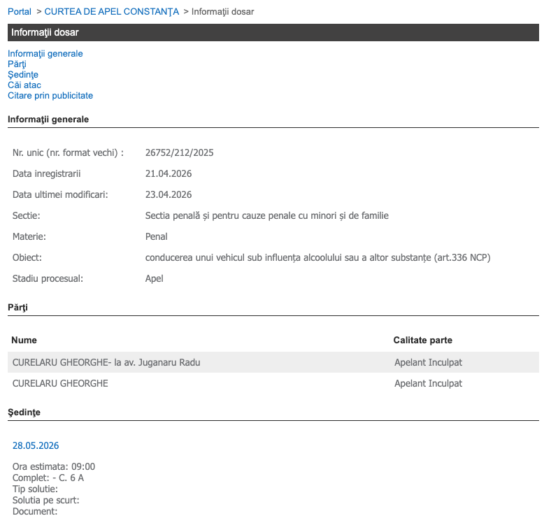 În cauză, cel care a primit condamnare la Judecătoria Constanța se numește Curelaru Gheorghe, iar procurorii Parchetului de pe lângă Judecătoria Constanța l-au deferit justiției pentru conducerea unui autovehicul sub influența alcoolului sau a altor substanțe.