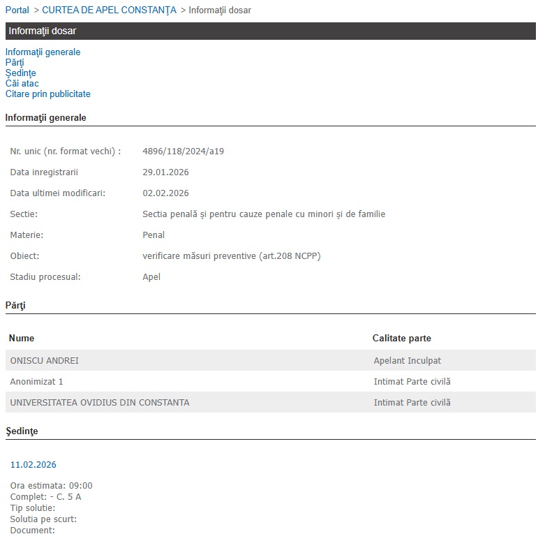 Conform Portalului Instanțelor de Judecată, la termenul anterior, din 29 ianuarie anul curent, Curtea de Apel Constanța a fixat pronunțarea pentru miercuri, 11 februarie 2026.