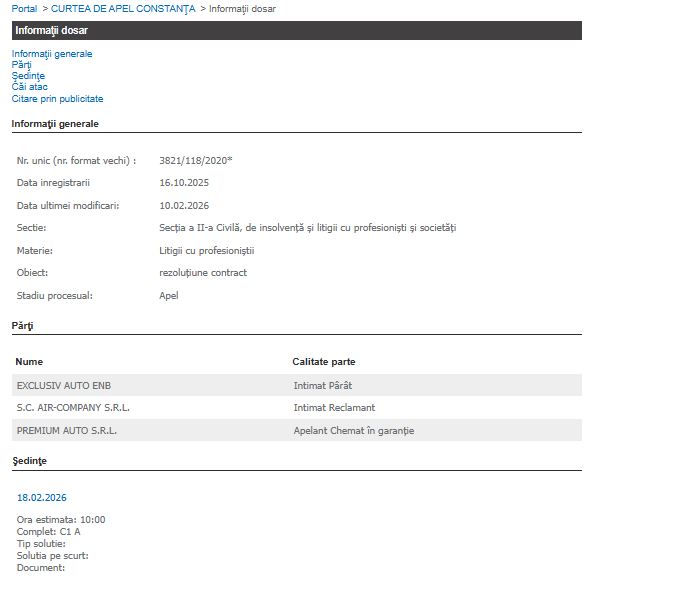 Litigiul, înregistrat sub numărul 3821/118/2020* este cel unde societatea Premium Auto SRL are calitatea de apelant chemat în garanție, contestând deciziile anterioare în raport cu intimata reclamantă SC Air-Company SRL și intimata pârâtă Exclusiv Auto ENB.