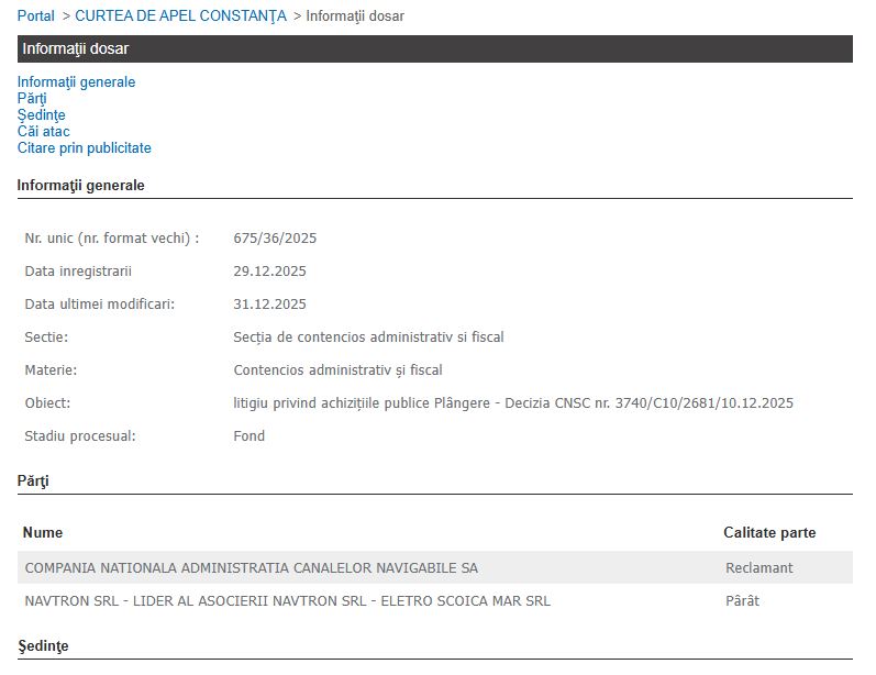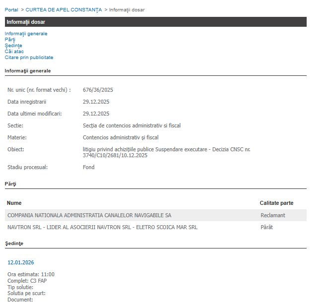 Pe rolul Curții de Apel Constanța se află două dosare în care părți sunt Compania Națională Administrația Canalelor Navigabile SA– reclamant și Navtron SRL- lider al asocierii Navtron SRL - Eletro Scoica Mar SRL, iar vizată este decizia CNSC nr. 3470/C10/2691/10.12.2025.În dosarul 675/36/2025 obiect este litigiu privind achiziţiile publice Plângere - Decizia CNSC nr. 3740/C10/2681/10.12.2025, iar în dosarul 676/36/2025 obiect este litigiu privind achiziţiile publice Suspendare executare - Decizia CNSC nr. 3740/C10/2681/10.12.2025.
