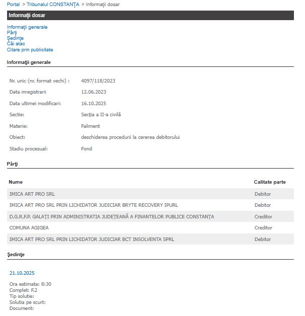 Pe rolul Tribunalului Constanța – Secția a II-a civilă se află dosarul nr. 4097/118/2023, având ca obiect deschiderea procedurii de faliment la cererea debitorului ImicaArt PRO SRL, societate cu sediul în Agigea, județul Constanța.