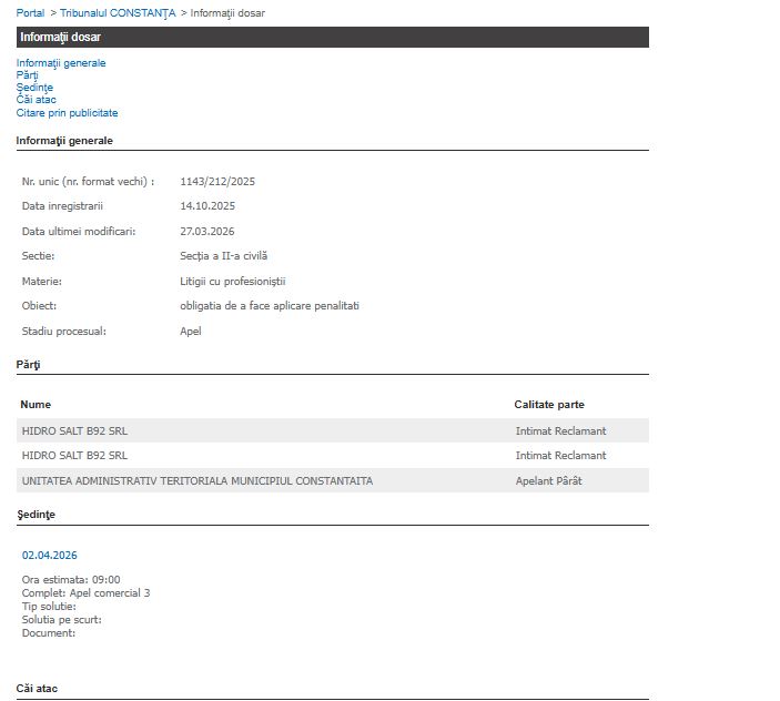 Tribunalul Constanța a stabilit pentru astăzi, 2 aprilie 2026, o nouă etapă procesuală în conflictul juridic dintre Unitatea Administrativ Teritorială (UAT) Municipiul Constanța și societatea Hidro Salt B92 SRL.