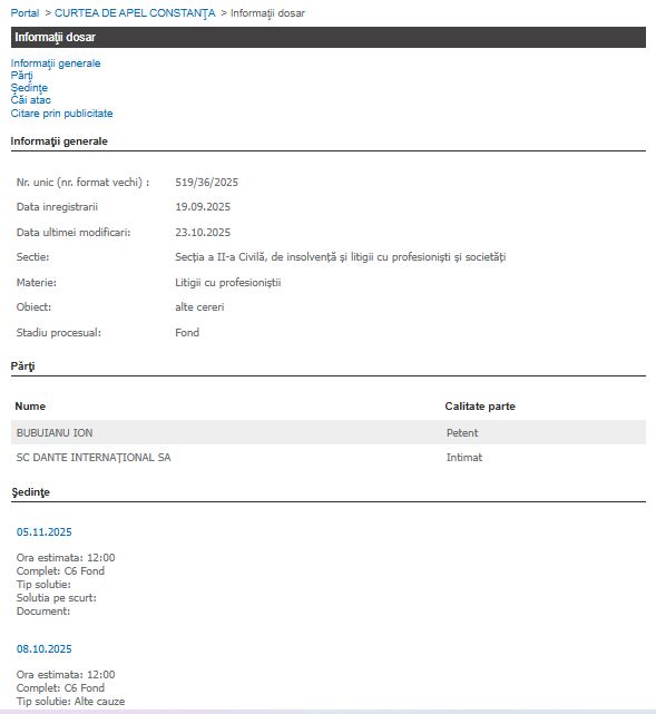 Pe data de 19 septembrie 2025, la Curtea de Apel Constanța, a fost înregistrat un nou dosar sub numărul 519/36/2025, având ca obiect "alte cereri" în materia Litigiilor cu profesioniștii. Cauza se află în stadiul de fond și este judecată de Secția a II-a Civilă, de insolvență și litigii cu profesioniști și societăți.