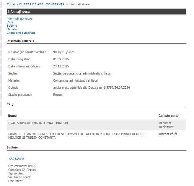 Dosarul HVAC Shipbuilding International SRL privind contestarea Deciziei nr. S-5752/24.07.2024 emisă de Agenția pentru Întreprinderi Mici și Mijlocii și Turism Constanța are termen azi, 12 ianuarie 2025, la Curtea de Apel Constanța,C3 Recurs.