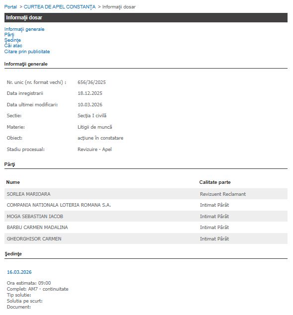 Magistrații Secției I Civile din cadrul Curții de Apel Constanța au pe rol un dosar de revizuire ce vizează un litigiu de muncă între reclamanta Sorlea Marioara și Compania Națională Loteria Română SA.