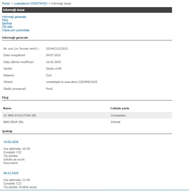 Un dosar de contestație la executare(nr.20244/212/2025) a ajuns astăzi, 19 februarie 2026, în fața magistraților de la Judecătoria Constanța.