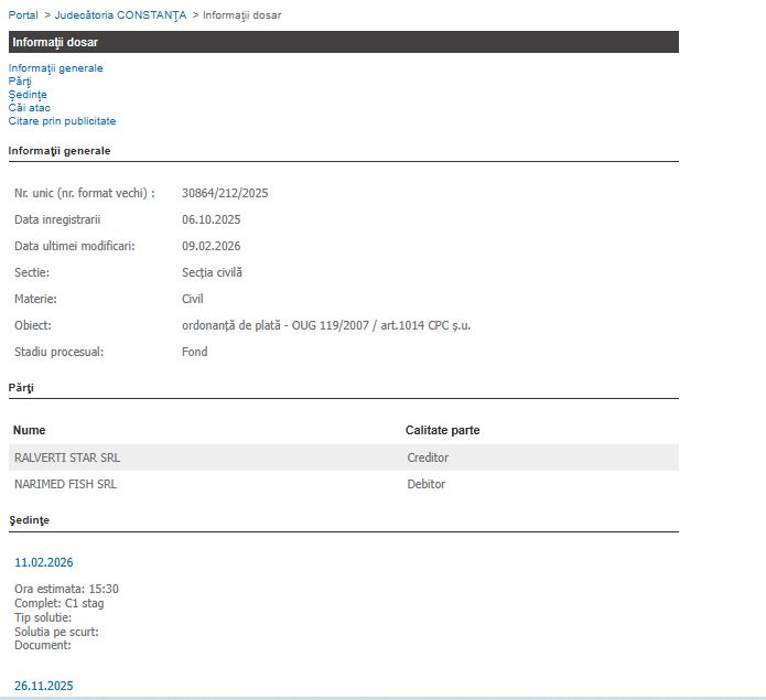 Azi, 11 februarie, este termen la Judecătoria Constanța în dosarul 30864/212/2025, în dosarul ce privește conflictul comercial între Ralverti Star SRL din Constanța și Narimed Fish SRL din Tulcea