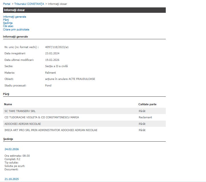 Magistrații de la Secția a II-a Civilă a Tribunalului Constanța au pe rol un nou termen în dosarul nr. 4097/118/2023/a1, ce vizează procedura falimentului societății SC Tami Transerv SRL. Obiectul principal al acestei cauze este o acțiune în anulare a unor acte frauduloase, introdusă de lichidatorii judiciari.