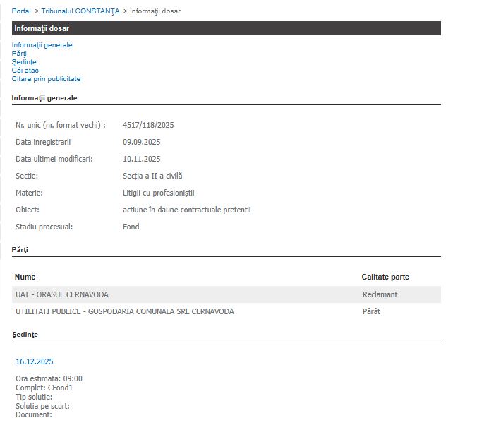 Azi, 16 decembrie, a fost stabilit termen în dosarul 4517/118/2025 ce vizează Primăria Cernavodă care dă în judecată firma de utilități publice.Potrivit Portalului Instanțelor de Judecată, ședința de la Tribunalul Constanța a fost programată pentru ora 09.00, complet CFond1