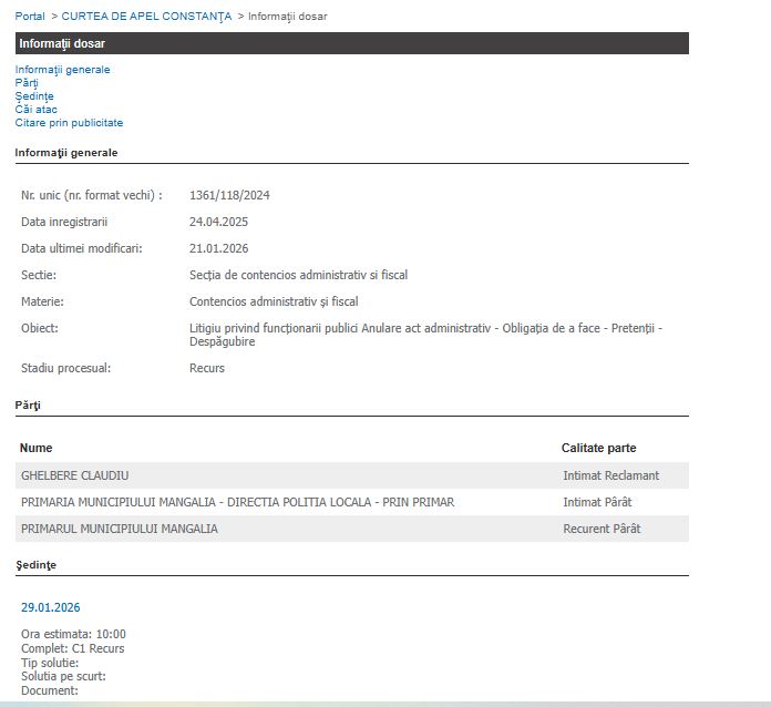„Prin cererea de chemare în judecată formulată și înregistrată pe rolul Tribunalului Constanţa în data de 29.02.2024, sub numărul unic de dosar ####/118/2024, reclamantul ######## #######, în contradictoriu cu pârâţii PRIMĂRIA MUNICIPIULUI MANGALIA - DIRECTIA ####### LOCALA PRIN ###### şi PRIMARUL MUNICIPIULUI MANGALIA, a solicitat instanţei să dispună: - în temeiul art. 18 alin. (1) din Legea contenciosului administrativ nr. 554/2004, cu modificările şi completările ulterioare, coroborat cu dispoziţiile art. 20 alia (5) din Anexa nr. 6 la O.U.G. nr. 57/2019 privind Codul administrativ, cu modificările şi completările ulterioare, anularea, în integralitate, a Raportului de evaluare nr. 1291/09.01.2024 întocmit pentru activitatea desfăşurată în perioada 01.01.2023-31.12.2023. şi, pe cale de consecinţă, anularea Dispoziţiei nr. 490/13.02.2024 privind încetarea raporturilor de serviciu ale subsemnatului, în conformitate cu dispoziţiile art. 527 alin. (1) din O.U.G. nr. 57/2019 privind Codul administrativ, cu modificările şi completările ulterioare; - în temeiul art. 527 alin. (2) din O.U.G. nr. 57/2019 privind Codul administrativ, cu modificările şi completările ulterioare, reintegrarea subsemnatului în funcţia publică de execuţie deţinută anterior, respectiv cea de poliţist local, clasa 1. grad profesional superior, gradaţia 5. în cadrul Serviciului Ordine ####### şi Circulaţie pe Drumurile Publice - Direcţia ####### Locală, sau, în cazul în care funcţia publică nu mai există, reintegrarea într-o funcţie publică echivalentă: - în temeiul art. 8 alin. (1) raportat la art. 18 alin. (1) din Legea contenciosului administrativ nr. 554/2004. cu modificările şi completările ulterioare, şi dispoziţiile art. 527 alin. (1) din O.U.G. nr. 57/2019 privind Codul administrativ, cu modificările şi completările ulterioare, obligarea pârâţilor la plata de despăgubiri materiale reprezentând drepturile salariale, indexate cu dobânda legală şi indicele de inflaţie, de care am fost lipsit, începând cu data de 14.03.2024 şi până la repunerea efectivă a subsemnatului în funcţia publică de execuţie de poliţist local, clasa I. grad profesional superior, gradaţia 5, în cadrul Serviciului Ordine ####### şi Circulaţie pe Drumurile Publice - Direcţia ####### Locală; - în temeiul art. 453 alin. (1) C. Proc. Civ., obligarea pârâţilor la plata cheltuielilor de judecată ocazionate de prezentul litigiu.”- se arată pe rejust.ro.