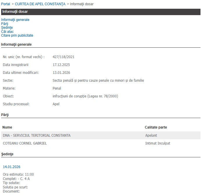 Potrivit datelor instanței, cauza este înregistrată cu numărul unic 427/118/2021, iar apelul a fost declarat de DNA la data de 5 septembrie 2025. Dosarul se află pe rolul Secției penale și pentru cauze penale cu minori și de familie a Curții de Apel Constanța, având ca obiect infracțiuni de corupție prevăzute de Legea nr. 78/2000.