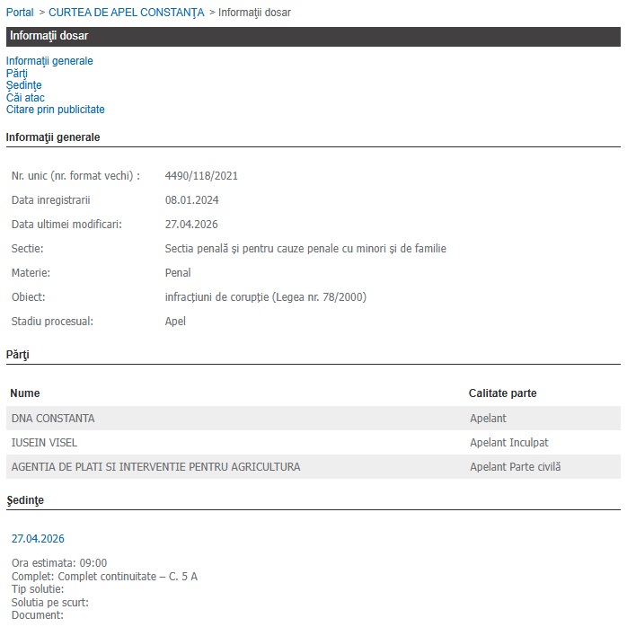 Mai precis, potrivit Portalului Instanțelor de Judecată, în cursul acestei zile, judecătorii sunt așteptați să se pronunțe în dosarul cu indicativul 4490/118/2021, într-un dosar de corupție în care Tribunalul Constanța a încetat procesul penal faţă de edil, ca urmare intervenirii prescripţiei generale a răspunderii penale, însă l-a obligat la plata către partea civilă - Agenţia de Plăţi şi Intervenţie pentru Agricultură (APIA) - a sumei totale de 436.445,02 lei. Cauza se află în atenția Curții de Apel, instanță la care decizia a fost atacată atât de către primar, cât și de către procurorii DNA și de APIA.