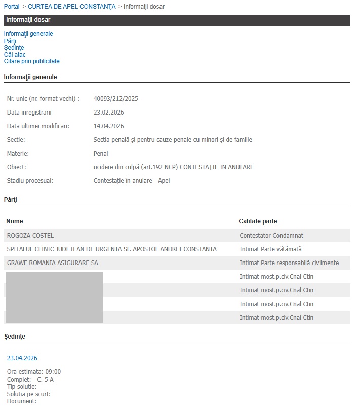 Demersul pentru anularea pedepsei a fost înregistrat inițial la Judecătoria Constanța, însă la data de 20 februarie, anul curent, cauza a fost declinată în favoarea Curții de Apel Constanța.