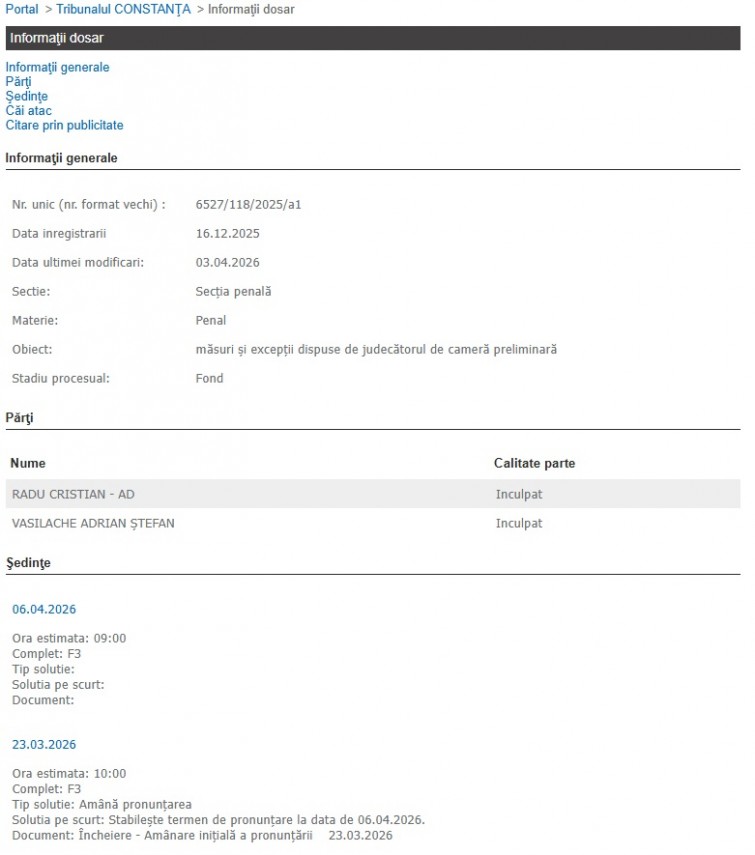 Potrivit Portalului Instanțelor de Judecată, termenul a fost programat pentru astăzi, după ce la termenul anterior, din 23.03.2026, a fost amânată pronunțarea.