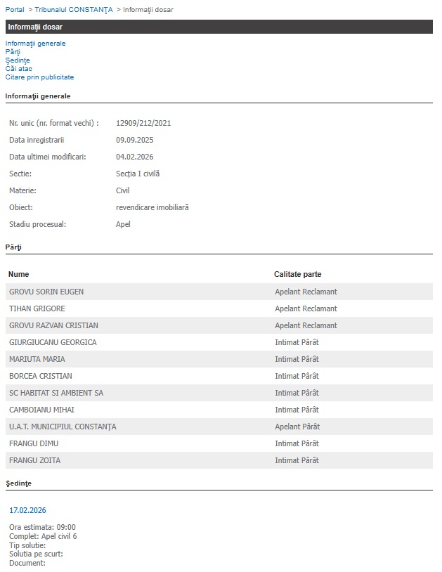 Un termen important se desfășoară, astăzi, 17.02.2026, la Tribunalul Constanța, instanță la care se judecă apelul în dosarul litigiului care are ca obiect revendicarea unui teren de 280 mp situat în Constanța!