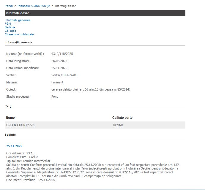 Dosarul nr. 4312/118/2025, având ca obiect cererea debitorului Green County SRL privind deschiderea procedurii generale a insolvenței, este în curs de judecată la Secția a II-a civilă a Tribunalului Constanța, stadiul procesual fiind „Fond”.