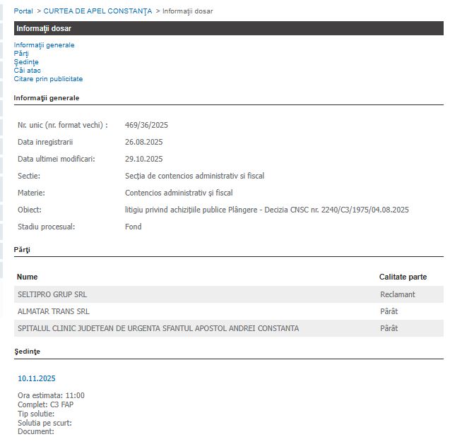 A fost stabilit termen inițial în dosar data de 15 septembrie 2025. Reclamant în cauză este Seltipro Grup SRL, iar pârâți sunt Almatar Trans SRL și Spitalul Clinic Județean de Urgență „Sf. Apostol Andrei” Constanța. Procesul se află în stadiul de fond și vizează achiziții publice.
